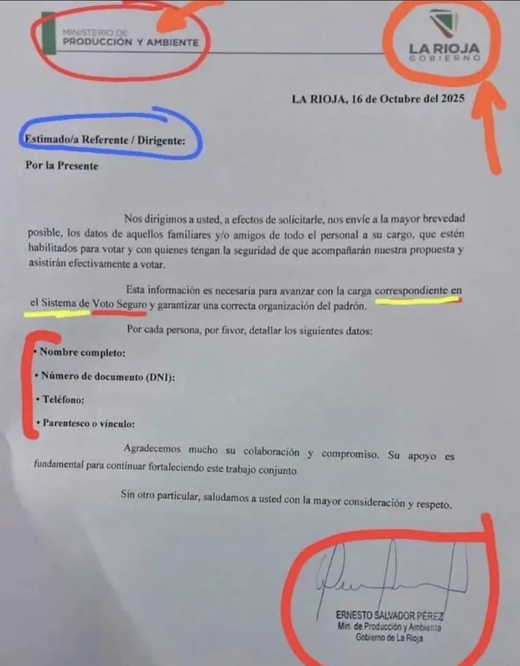 El texto, que circuló entre las dependencias públicas y lleva la firma del ministro, expresa de manera explícita: “Nos dirigimos a usted, a efectos de solicitarle, nos envíe a la mayor brevedad posible, los datos de aquellos familiares y/o amigos de todo el personal a cargo, que estén habilitados para votar y con quienes tengan la seguridad de que acompañarán nuestra propuesta y asistirán efectivamente a votar”.