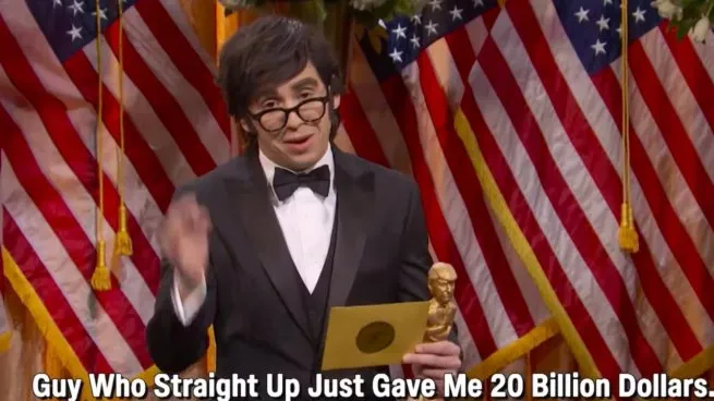La escena continuó con otra broma sobre el supuesto respaldo financiero de Estados Unidos. “Él sí incluyó un cheque por otros u$s10.000 millones… este hombre es increíble, bro”, agregó el falso Milei, antes de que apareciera Trump, interpretado por James Austin Johnson, habitual imitador del expresidente en el programa.